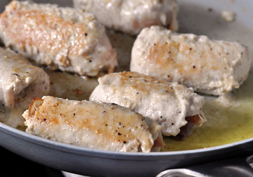 1. Разрезать каждую куриную грудку вдоль на 2 половины (это удобнее делать, когда курица частично замороженна). Положить куски курицы порциями в полиэтиленовый пакет (или между двумя слоями пищевой пленки) и отбить с обеих сторон молотком для мяса, пока куриное филе не станет тонким. Посолить, поперчить и посыпать чесночным порошком с обеих сторон. 2. На среднем огне разогреть половину масла, добавить нарезанный лук-шалот и готовить до мягкости, 5-7 минут. 3. Положить один кусок отбитой куриной грудки на плоскую поверхность. На середину выложить чайную ложку пожаренного лука-шалота, согнутую пополам полоску пожаренного бекона и чайную ложку натертого Пармезана. Свернуть курицу рулетиком, немного загибая боковые края, чтобы начинка оказалась внутри. Повторить с оставшимися кусками курицы. 4. Разогреть оставшееся масло в той же сковороде. Обжарить куриные рулетики со всех сторон. Уменьшить огонь, накрыть крышкой и готовить еще 5-7 минут, до полной готовности курицы.